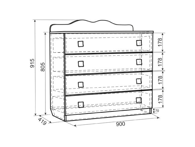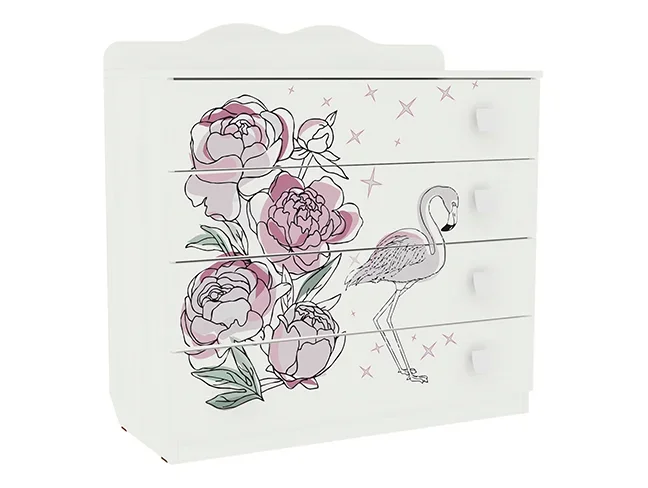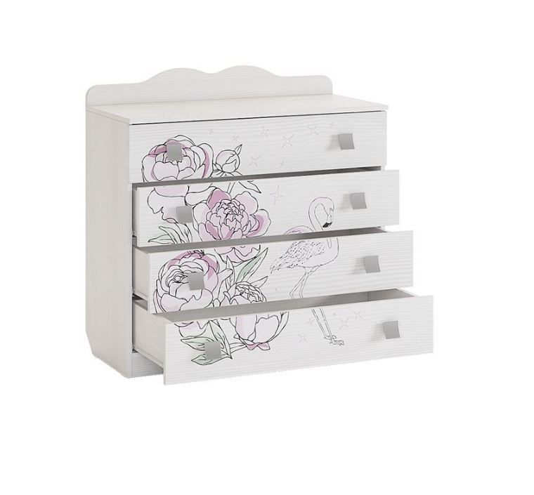 Оригинальный и вместительный детский комод. Модель содержит 4 выдвижных ящика, в которых легко поместятся игрушки, одежда и спальные принадлежности. Корпус и фасады комода выполнены в мягком белом цвете, что способствует успокаивающему действию. На фасады нанесен устойчивый к истиранию и ультрафиолету рисунок. Данная модель точно станет украшением детской комнаты и добавит интересный акцент в любое интерьерное решение.