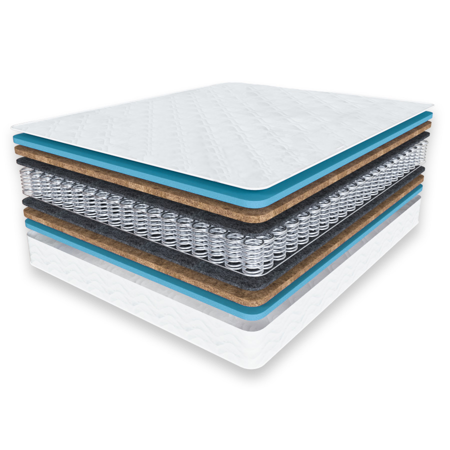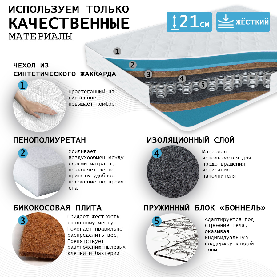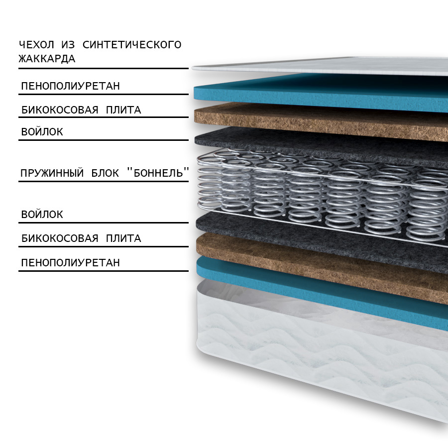 · Пенополиуретан – гипоаллергенный и влагостойкий материал, устойчивый к высоким нагрузкам. Он придает матрасу мягкость, сохраняя упругость и эластичность.· Бикокосовая плита - это смесь натуральных и синтетических волокон, способствует равномерному распределению веса и улучшает циркуляцию воздуха в спальном месте.