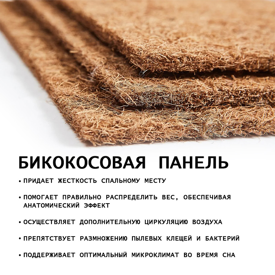 · Бикокосовая плита - это смесь натуральных и синтетических волокон, способствует равномерному распределению веса и улучшает циркуляцию воздуха в спальном месте.