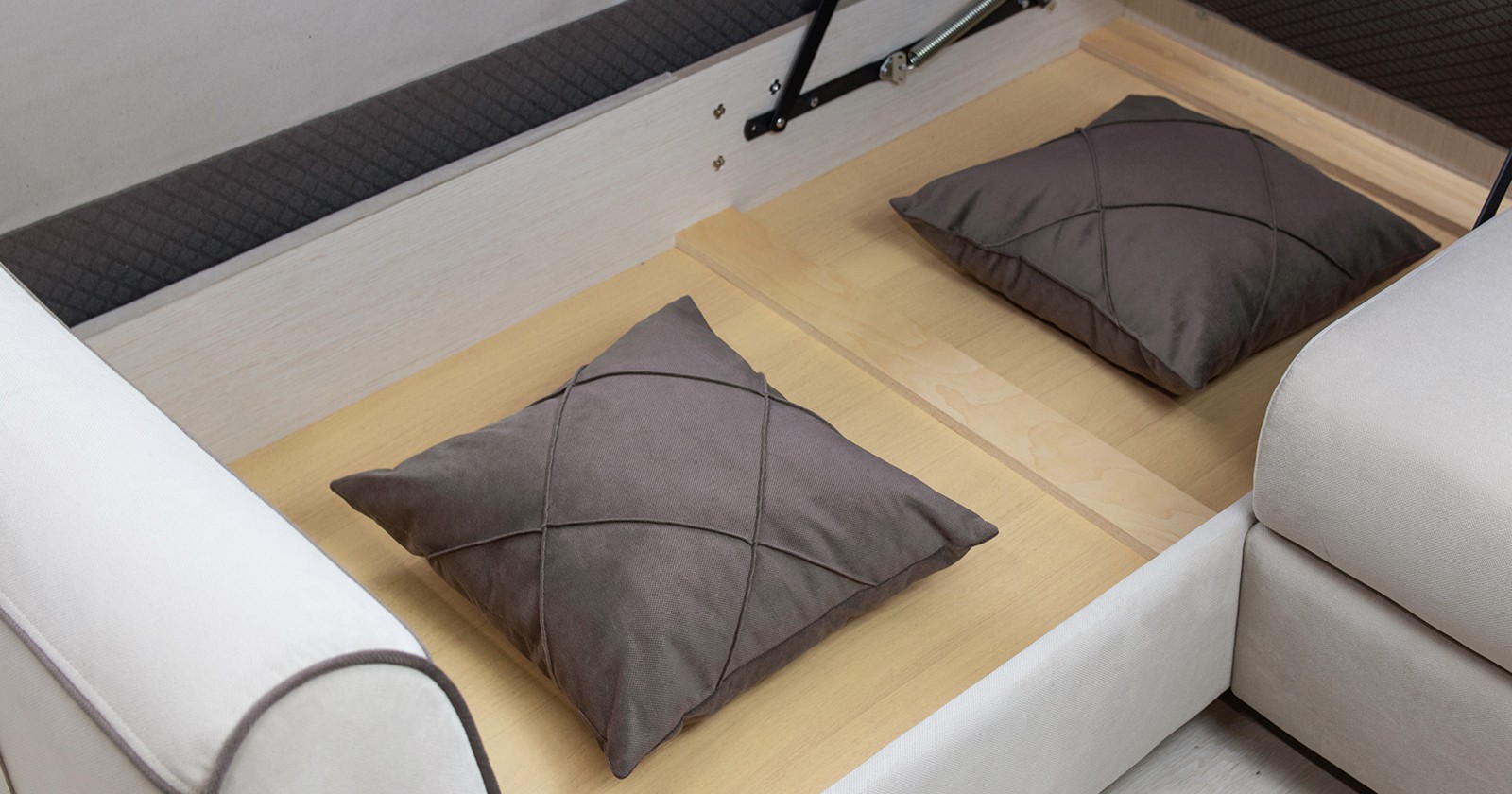 • Четыре декоративные подушки (44x44 см) с современным наполнителем из шариков сорэль для дополнительного уюта.