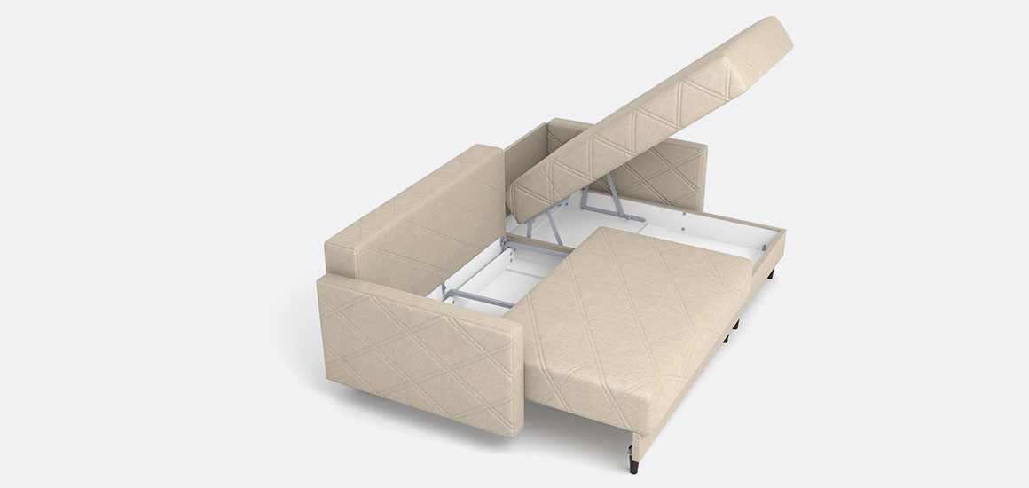 • Умная организация пространства: Модель оснащена двумя вместительными бельевыми ящиками — в оттоманке и в раскладной секции. Это решает вопрос хранения, освобождая место в шкафах.