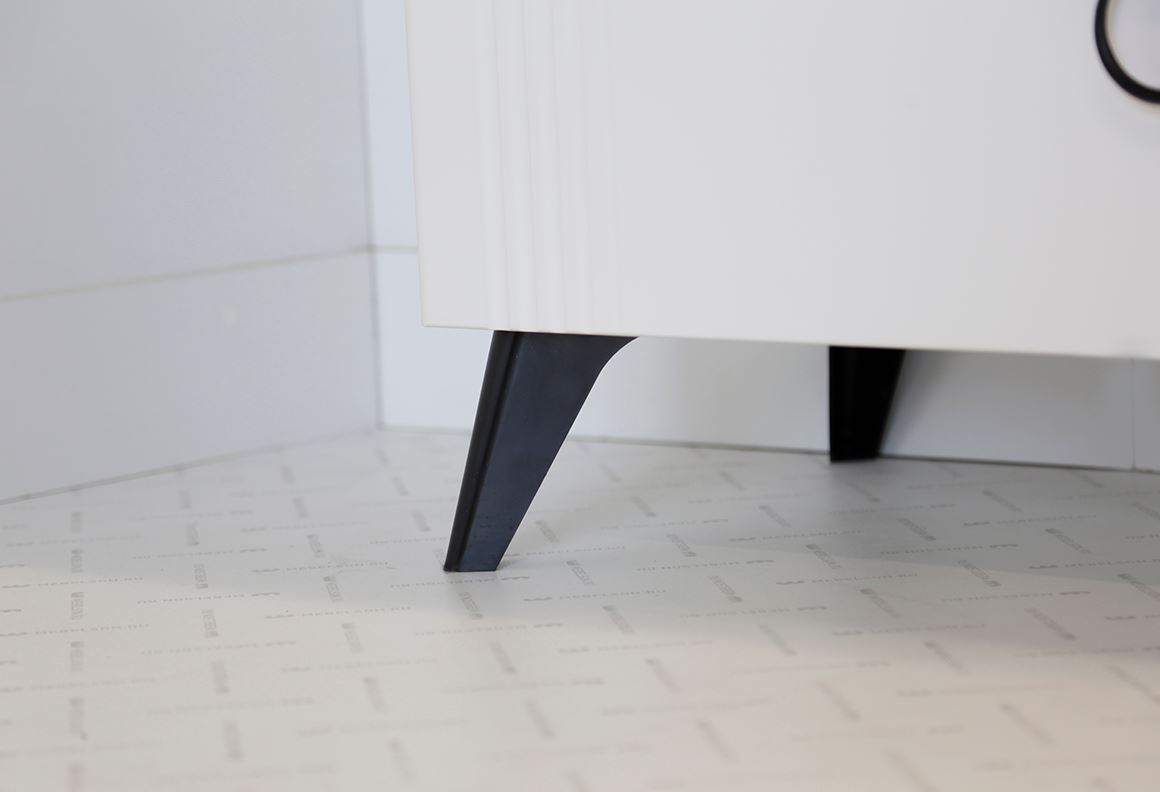Черные пластиковые опоры высотой 120 мм визуально облегчают конструкцию и облегчают уборку под тумбой.