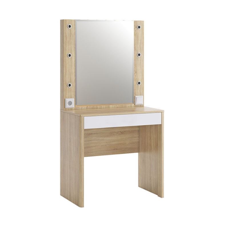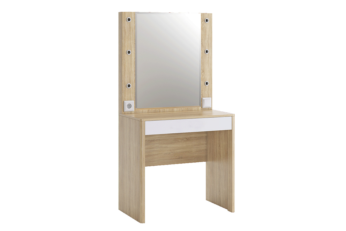 Оригинальное и стильное трюмо из серии «Зара». В зеркало с широким фацетом, встроена подсветка c 6 лампочками, как в столах профессиональных визажистов. Дополнительно имеется выключатель, розетка для фена и выдвижной ящик для украшений и косметики. Закругленные углы, подчеркивают общий стиль коллекции.