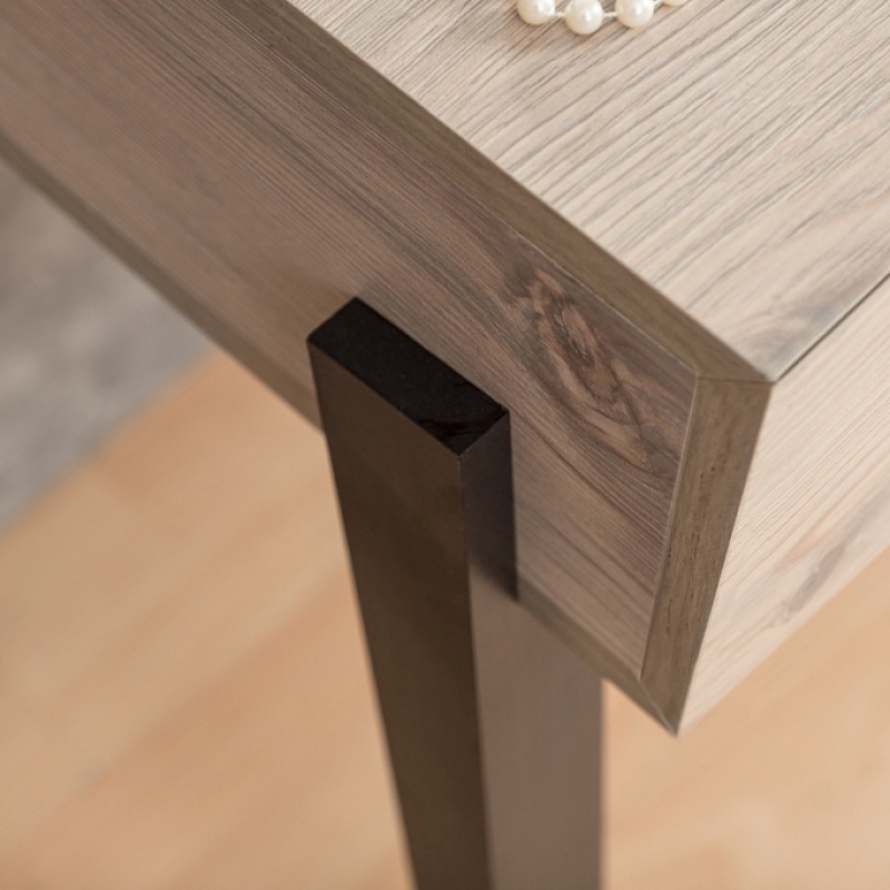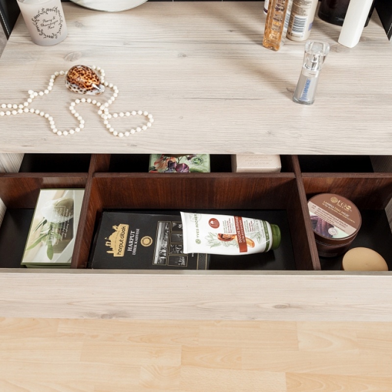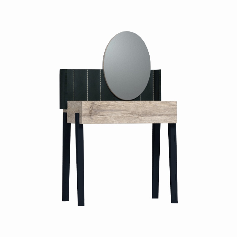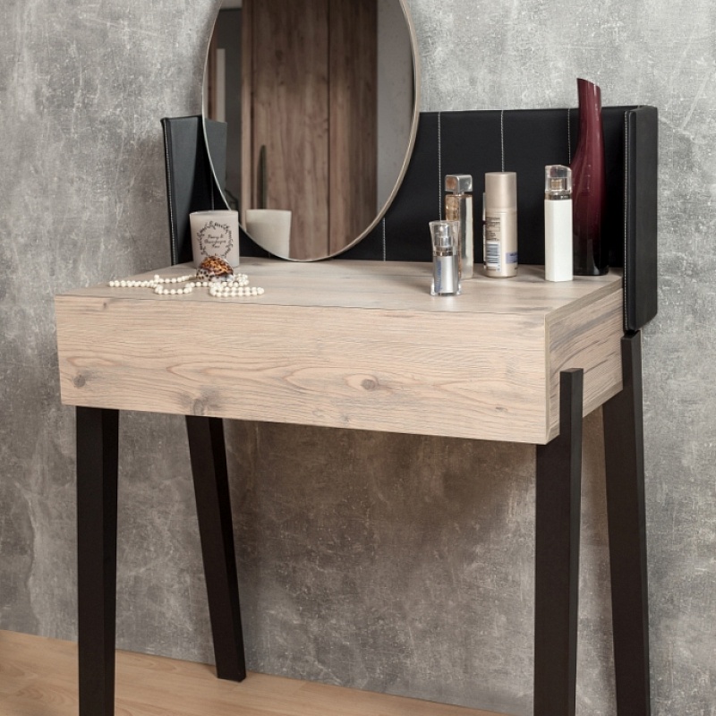 Современный и функциональный туалетный столик с овальным зеркалом, вместительным выдвижным ящиком с разделителями в подстолье на четырех высоких ножках.